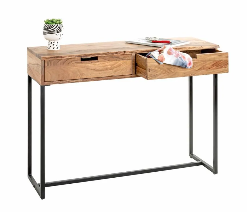 Der aparte Konsolentisch Rivera von Haku vereint die klare Linienführung modernen Designs mit warmen Attributen des angesagten Nature-Looks. Egal, ob Sie diesen eleganten Beistelltisch im Flur aufstellen oder er Ihr Ambiente im Wohn- oder Arbeitszimmer vervollständigt, seine beiden Schubladen bieten begehrten Stauraum. Der charmante Konsolentisch Rivera punktet mit einer natürlich gestalteten Tischplatte, auf der Sie sowohl nützliche Dinge platzieren als auch Designobjekte hübsch dekorieren können.