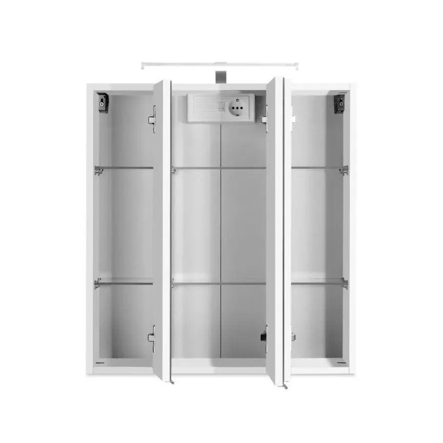 - Mit 3 Türen inkl. Türdämpfer und 6 Glaseinlegeböden (Belastbarkeit je Glasboden bis max. 3kg)