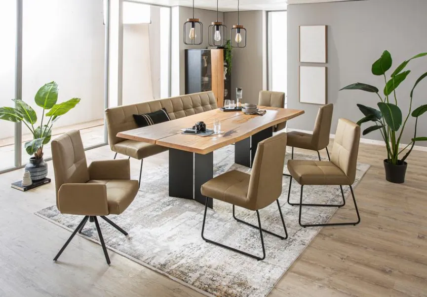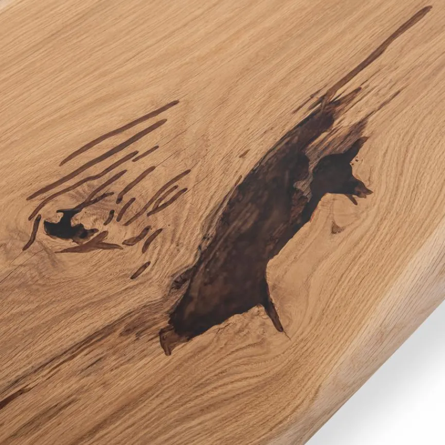 - Tischplatte mit natürliche Baumkante an der Längsseite und schräger Kante an der Stirnseite