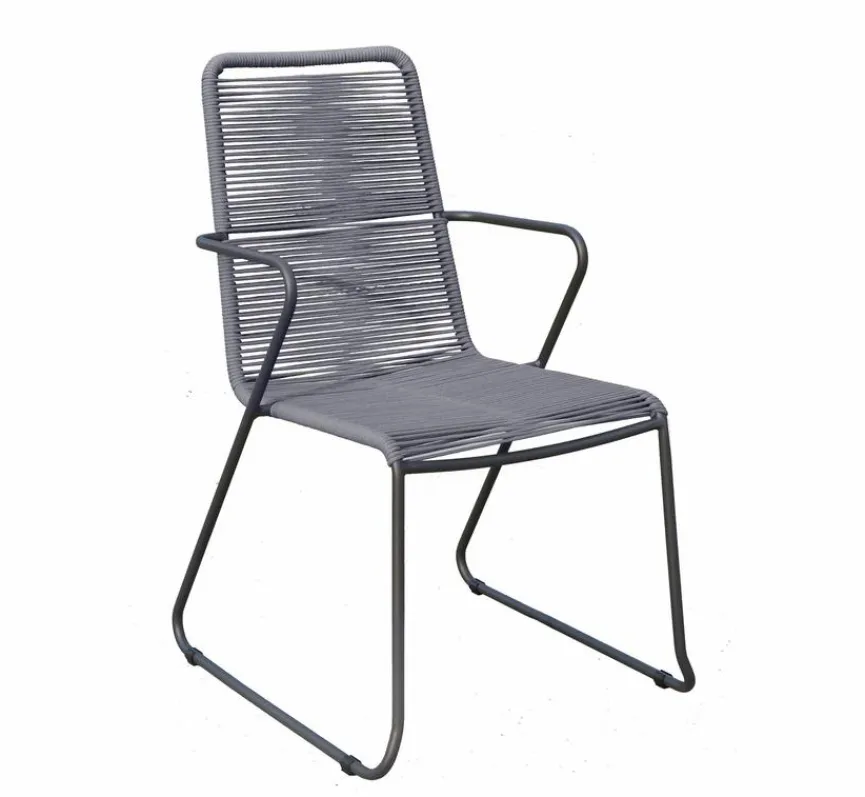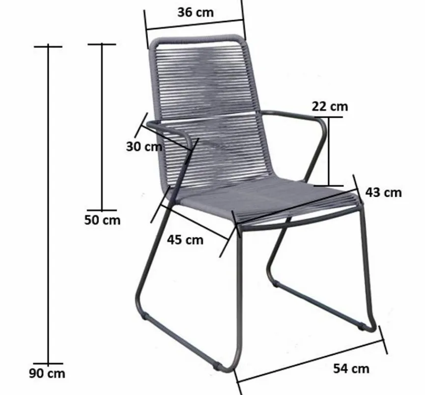 Moderner Kufen-Sessel in angesagtem Retro-Look. Filigranes Stahlgestell, sehr stabil, leicht und platzsparend stapelbar. Die Sitzfläche ist im angesagten Rope Style bespannt und egal ob dezent oder farbenfroh, die 4 Farbvarianten können individuell kombiniert werden. Der passende Tisch ist mit einer Platte in Holzoptik aus pflegeleichtem Polywood versehen und rundet den Look ab. Wer es puristischer mag, für den bietet der Tisch mit einer Glas-Keramik-Platte in Natursteinoptik, aus der gleichen Serie, eine Alternative.
