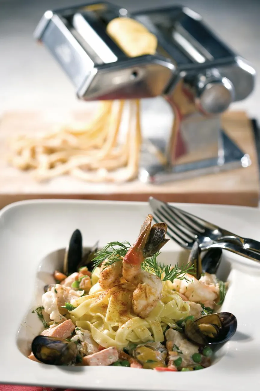 Dem aktuellen Trend zum Selbermachen entspricht die Nudelmaschine Pasta Perfetta de Luxe von GEFU. Mit ihrem glänzenden Retro-Look ist sie auch optisch eine Bereicherung für die Küche. Seien Sie kreativ und formen Sie mit der Nudelmaschine Pasta Perfetta de Luxe leckere Spaghetti, Tagliatelle, Ravioli, Lasagne Ricce und sonstige italienische Köstlichkeiten.