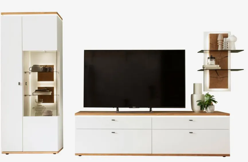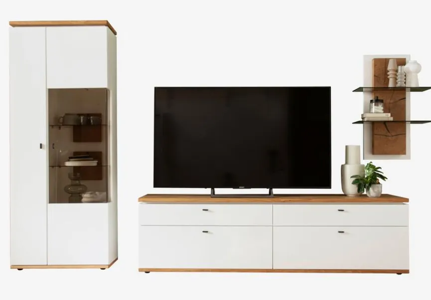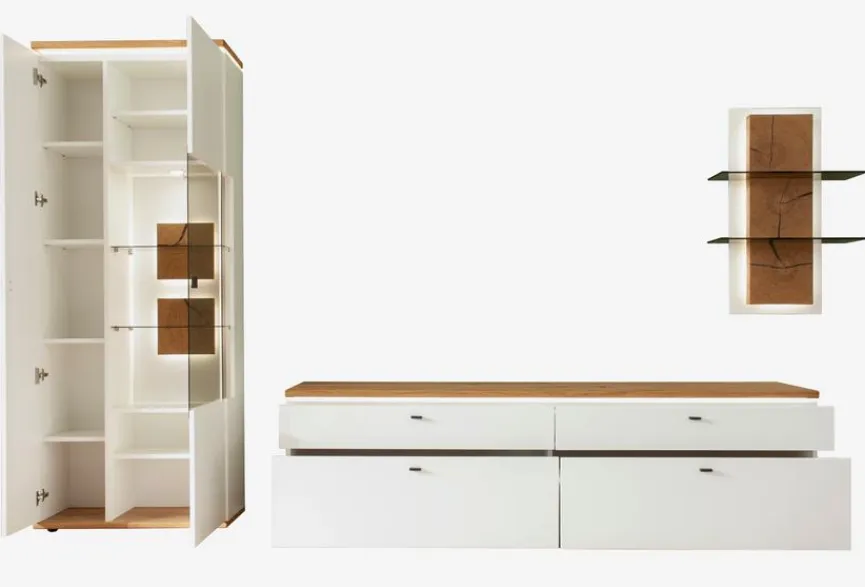 - Bestehend aus Vitrine, TV-Lowboard und Wandregal