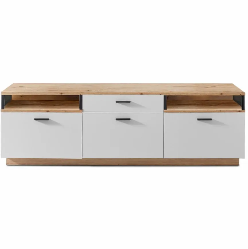 - Aus Holzwerkstoff (Spanplatte) mit kratzfester Melaminharzfolie in Modern White, Absetzung aus Spanplatte mit kratzfester Melaminharzfolie in Eiche Artisan, Sichtbare Rückwand aus Holzwerkstoff (HDF) mit kratzfester Melaminharzfolie in Eiche Artisan