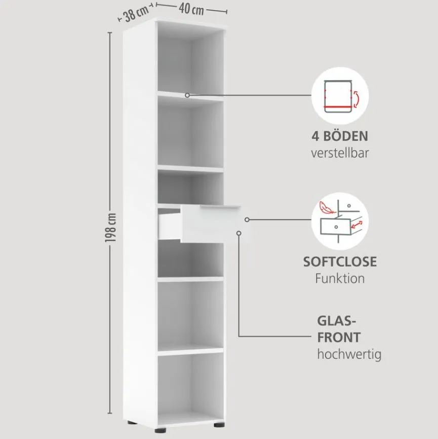 - Korpus aus Holzwerkstoff (Spanplatte) mit kratzfester Melaminhrazfolie in weiß, Front in weiß Glas