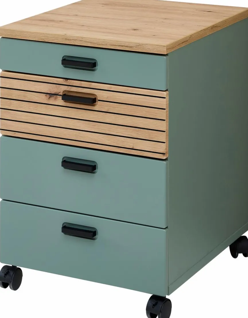 - Korpus aus Holzwerkstoff (Spanplatte) und Front aus Holzwerkstoff (MDF) mit hochwertiger Dekorfolie in Schilfgrün, mit Absetzung in Eiche Artisan