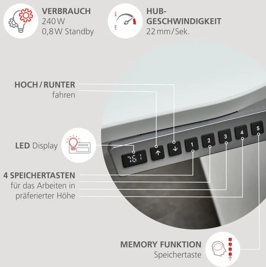 Wenn Sie zu jenen gehören, die auch bei Büroarbeiten Wert auf Gesundheit und gute Haltung legen, so eignet sich der Schreibtisch elektrisch Santorin von Innostyle ideal für Sie. Der höhenverstellbare Schreibtisch ermöglicht es Ihnen, ihn im Stehen oder auf verschiedenen Sitzhöhen zu verwenden. Durch seine Memory-Funktion lässt sich der Schreibtisch elektrisch Santorin kinderleicht auf Ihre bevorzugte Höhe einstellen.