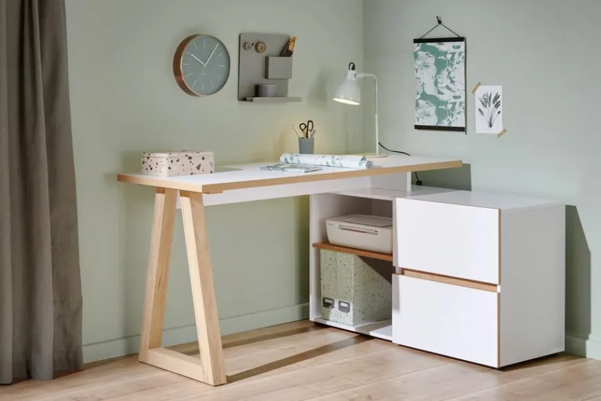 - Schreibtisch ist wechselseitig montierbar