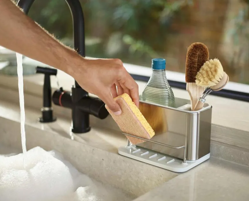 Für Ordnung und System beim Abwaschen sorgt der Spülbecken-Organizer Surface von Joseph Joseph. Er zeichnet sich durch eine hochwertige Verarbeitung und ein trendiges Design aus. Dank separater Fächer für Schwämme, Bürsten und Spülmittelflasche eignet sich der Spülbecken-Organizer Surface ideal, um beim Spülen alle Utensilien griffbereit und ordentlich zur Hand zu haben.