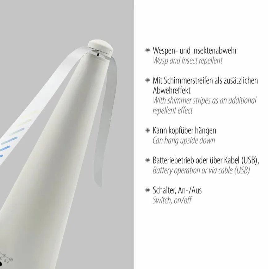 Wer in der warmen Jahreszeit kleine Plagegeister fernhalten möchte, trifft mit dem Fliegenwedler Swat von JUST LIGHT. eine gute Wahl. Der nützliche Helfer erweist sich als effektive Insekten-Abwehrmaßnahme und lässt sich ganz einfach mittels des An- und Ausschalters bedienen. Reflektor-Streifen auf den Rotorblättern tragen zusätzlich dazu bei, dass der Fliegenwedler Swat Wespen und Co. erfolgreich vertreibt.