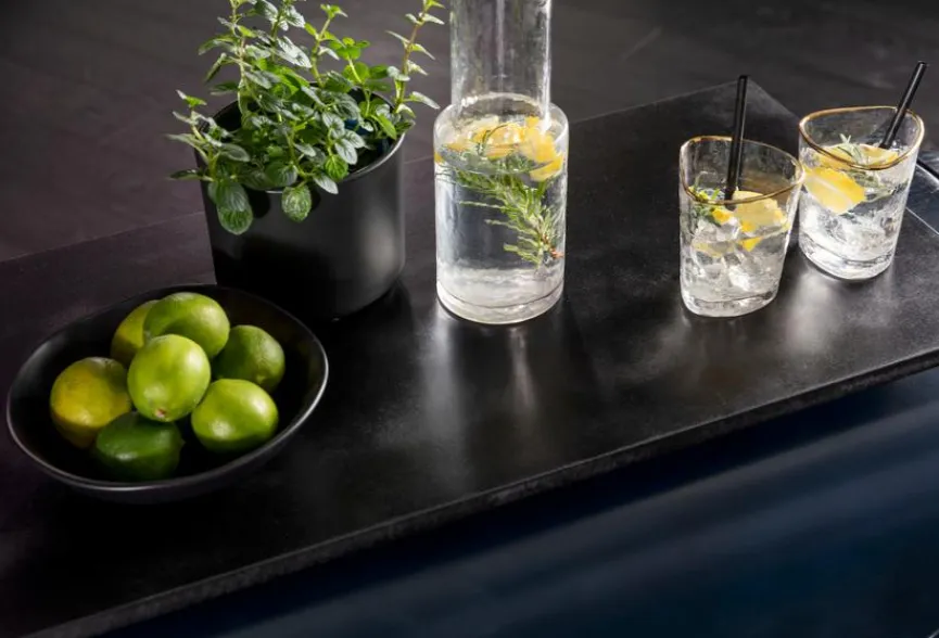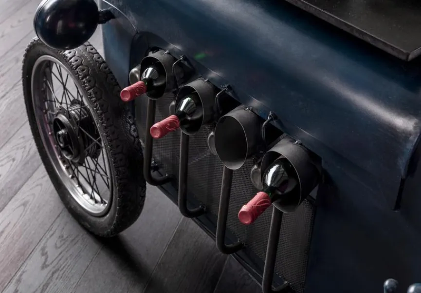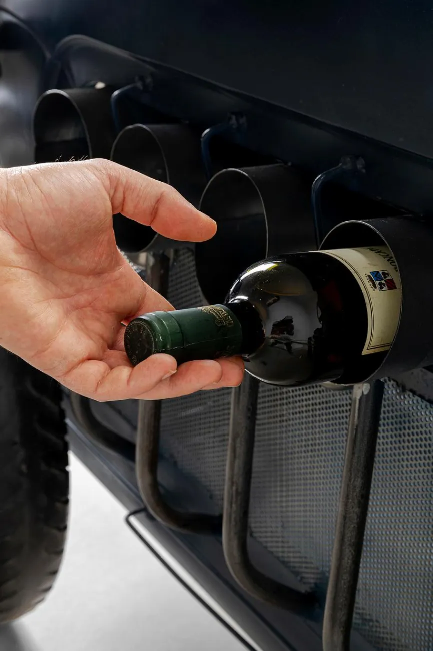 - Mit 1 Tür und 6 eingehängte Flaschenhalterungen dahinter, 6 seitlichen Flaschenhalterungen und 4 Glashalterungen für 8 Gläser seitlich