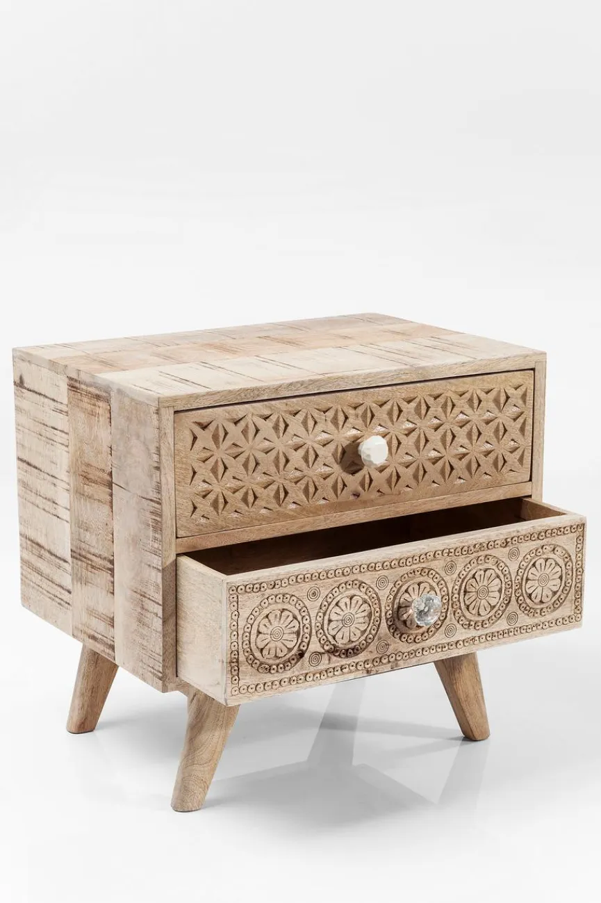 KARE präsentiert mit dem Nachttisch Puro Plain aus lackiertem Mangoholz einen echten Hingucker. Geschmackvolle Ornamente und stilvolle Griffe aus Knochen und Glas verleihen der Nachtkonsole einen individuellen und ansprechenden Look. In zwei Schubladen bietet der Nachttisch Puro Plain von KARE Platz für Bücher und andere Kleinigkeiten.