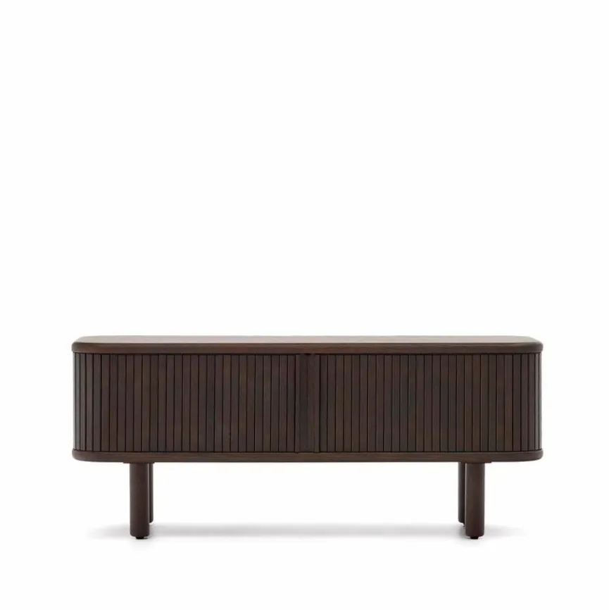 Das TV-Lowboard Mailen von Kave Home verkörpert sachlichen Chic, Extravaganz und Kreativität. Abgerundete Kanten und ein elegantes Lamellendesign, das an klassische Tambour-Rolladenmöbel denken lässt, machen diesen TV-Unterschrank zum Blickfang in Ihrem Zuhause. In einem bewusst schlicht gehaltenen Raum kann das TV-Lowboard Mailen zum Beispiel fantastisch wirken.