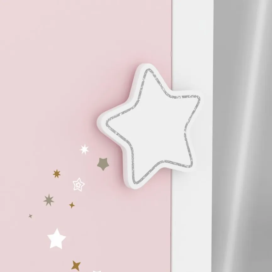 - Korpus aus Spanplatte mit kratzfester Melaminharzfolie in weiß, Front aus Holzwerkstoff (MDF) mit kratzfester Melaminharzfolie in pastellrosa und -grau, 3-farbiges Sternenmotiv in Siebdrucktechnik aufgetragen