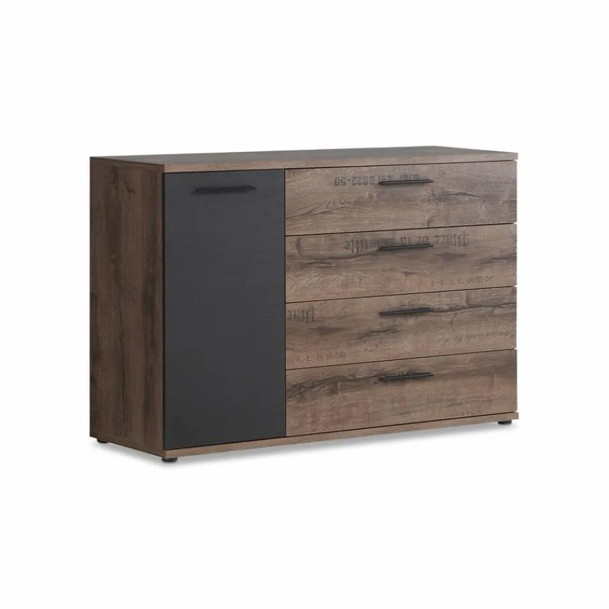 Die Kommode Jacky sticht durch ihr besonders schönes und edles Holzdesign hervor, das angenehm ins Auge fällt. Mit unterschiedlichen Einrichtungs- und Wohnstilen lässt sich dieser Schrank harmonisch kombinieren. Hinter einer Tür sowie in vier Schubladen stellt die Kommode Jacky viel Stauraum zu Verfügung.