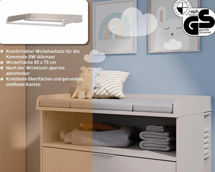 Der Wickelaufsatz Alkmaar von Germania verwandelt Ihre Kommode im Handumdrehen in einen komfortablen Wickelplatz. Mit stabiler Konstruktion und angenehm erhöhter Umrandung schafft der Wickelansatz ein sicheres, aufgeräumtes Umfeld beim Windelwechsel. Klare Linien fügen sich dezent in unterschiedliche Einrichtungsstile ein. Nach der Babyzeit lässt sich der Wickelaufsatz Alkmaar unkompliziert wieder abnehmen – für praktische Nutzung über den gesamten Familienalltag hinweg.