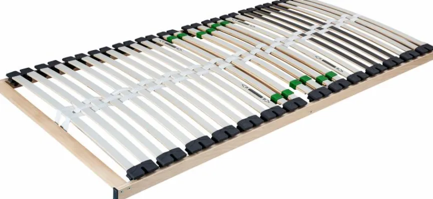 - Mit 14 Doppellattenelementen und flexible, bis an den Rand führende zur Abfederung durch holmüberlagernde Federungs-Duo-Kappen aus Kautschuk
