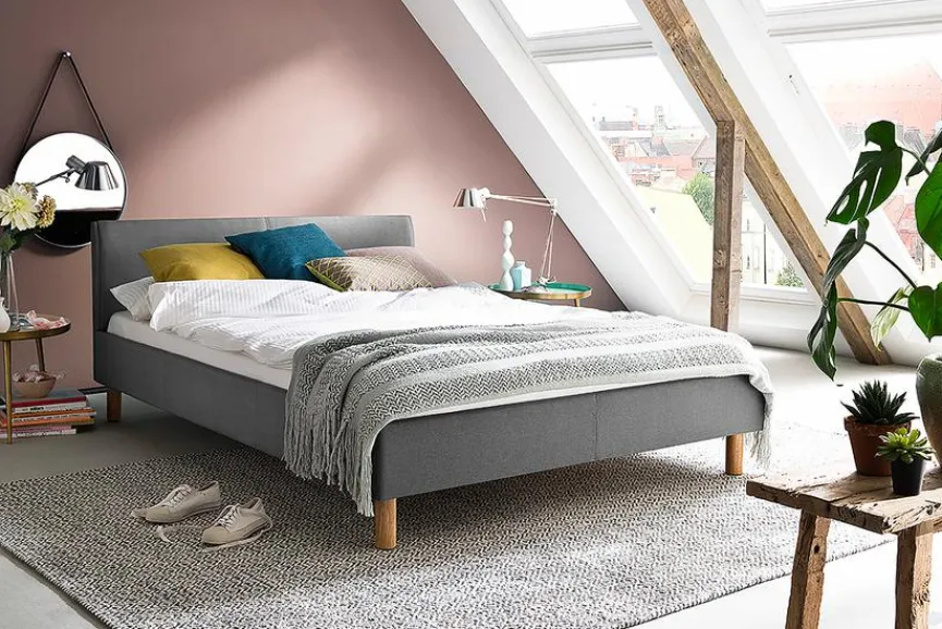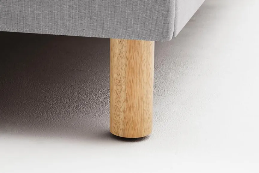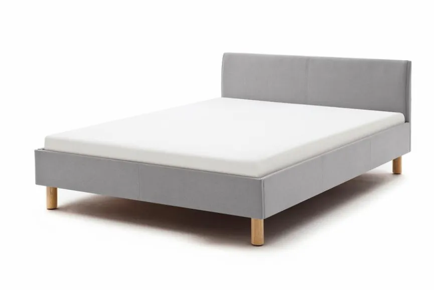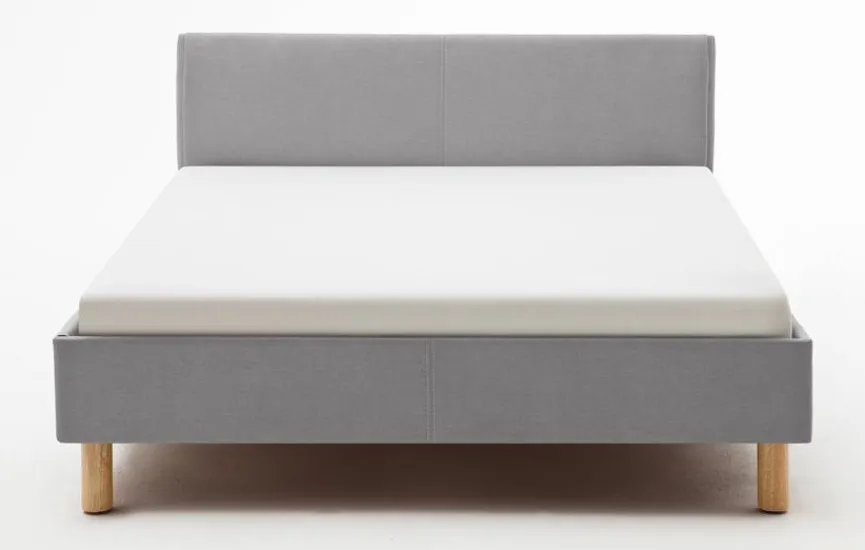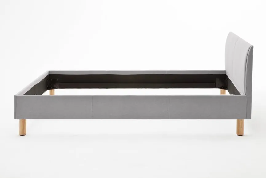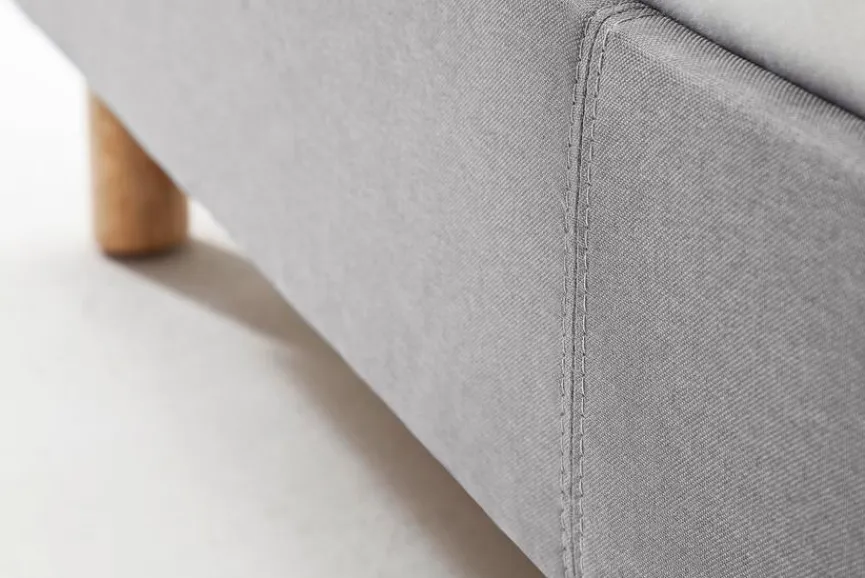 - Bettgestell aus Spanplatte, Füße aus massiver Eiche , Bezug aus 100 % Polyester in hellgrau