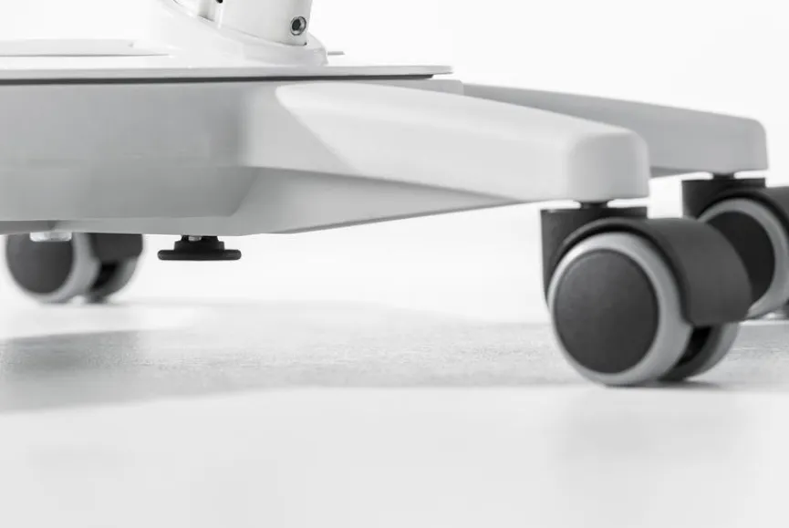 - Pendelnd gelagerte Rückenlehne, Höhe über Rastermechanik verstellbar, mit Universalrollen die für Hart- und Teppichboden geeignet sind