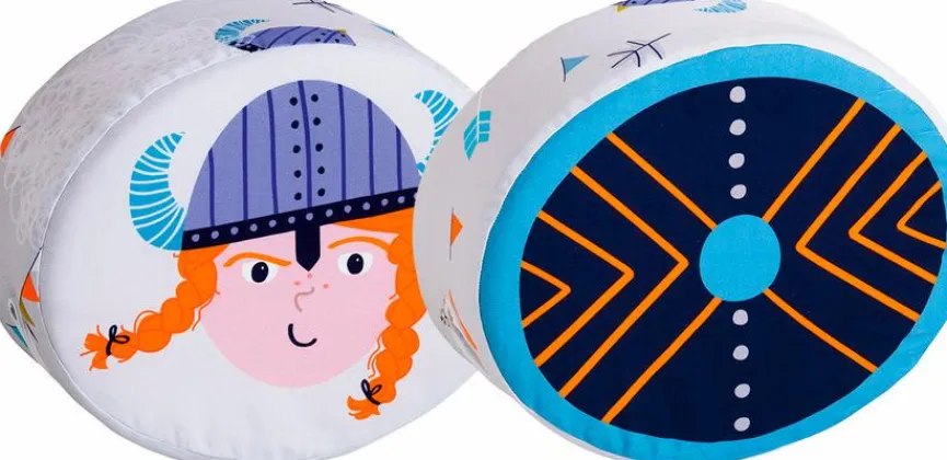 - Steckkissen zeigt ein Wikinger-Mädchen auf der Vorder- und ein Schild auf der Rückseite