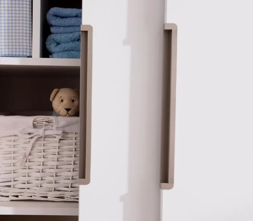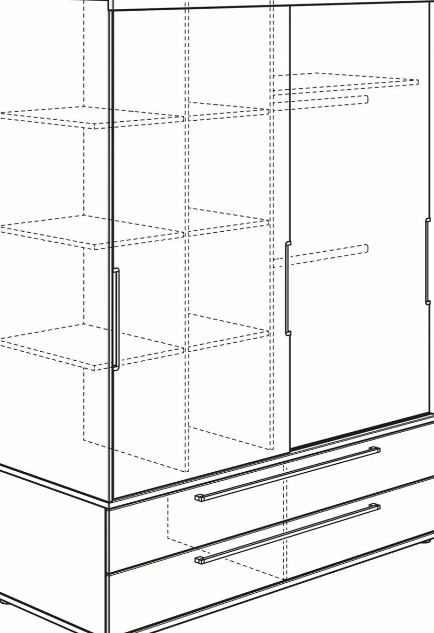 - Mit 2 Türen, 6 schmalen Einlegeöden, 1 breiten Einlegeboden, 2 Kleiderstangen und 2 Schubkästen