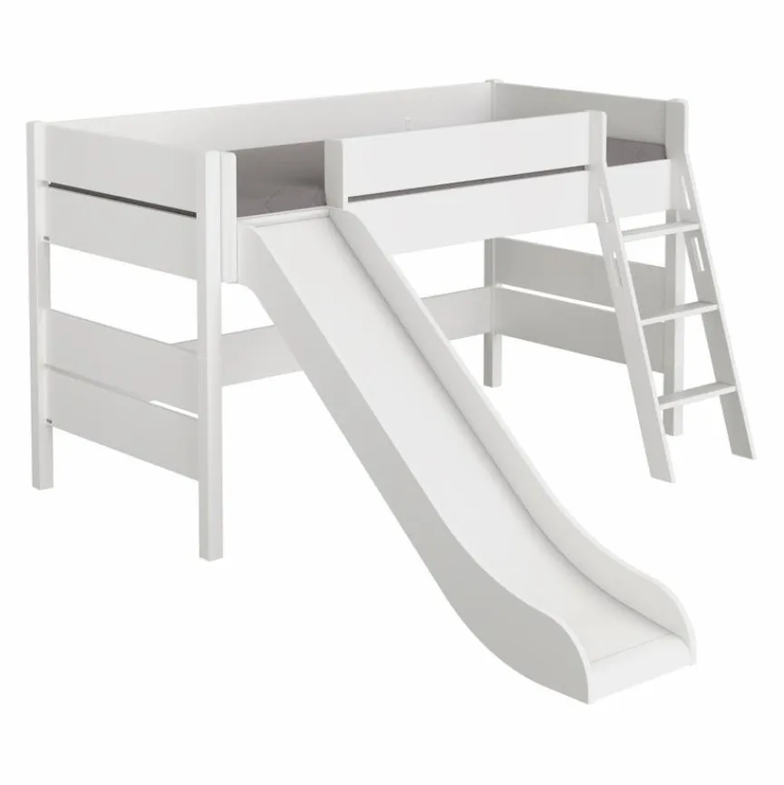 - Aus Holzwerkstoff (Spanplatte) mit kratzfester Melaminharzfolie in kreideweiß, Bettpfosten. Rutsche und Leiter aus massiver und kreideweiß lackierter Buche