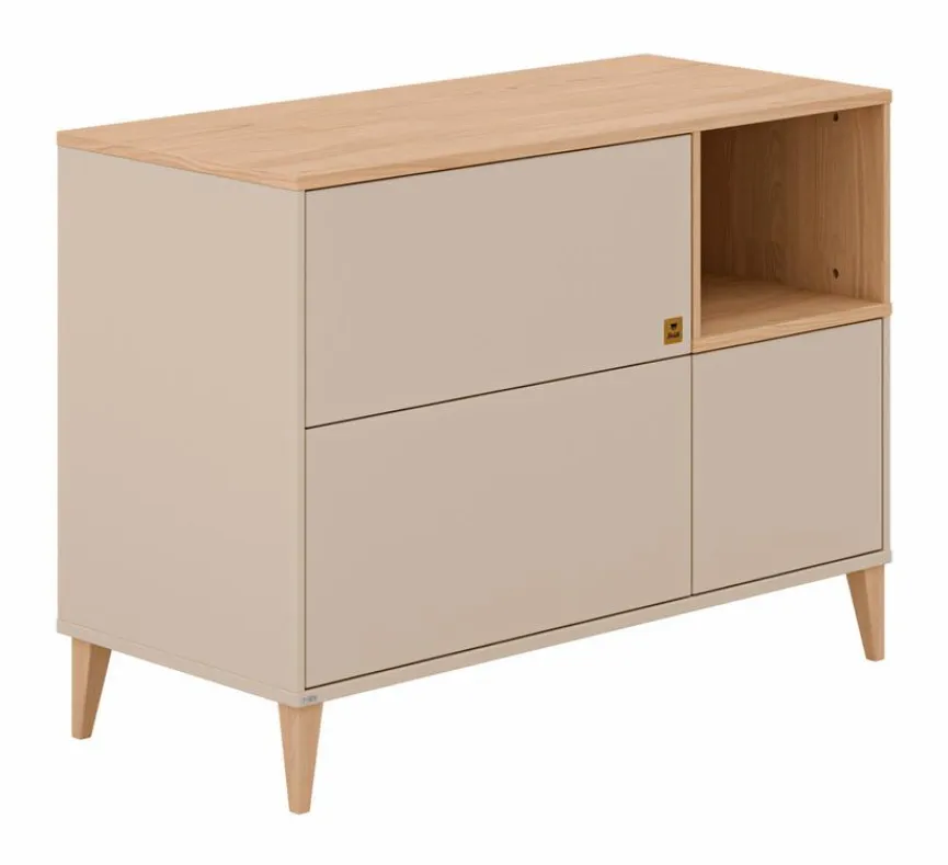 - Aus Spanplatte mit kratzfester Melaminharzfolie in Cashmere-Beige, Deckplatte und offenes Fach aus Spanplatte mit kratzfester Melaminharzfolie in Scandinavian Wood, Füße aus Massivholz in Buche
