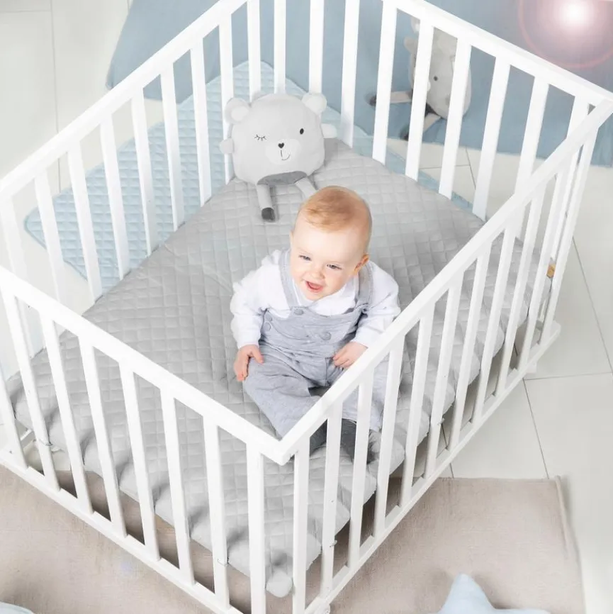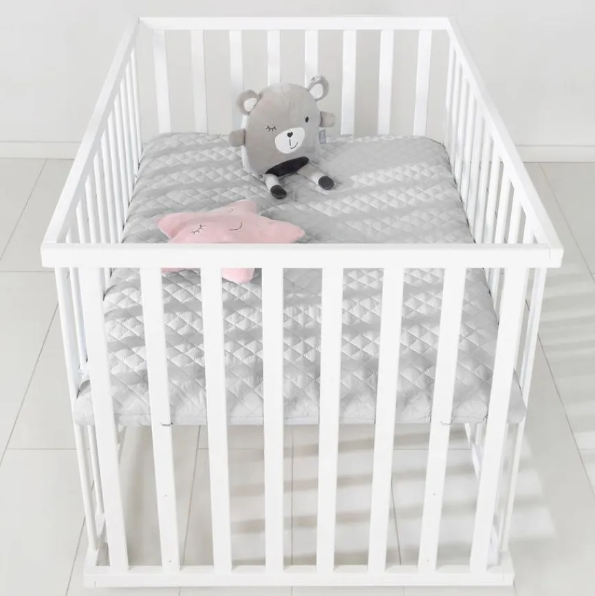 - Aus Holzwerkstoff (Schichtzolz) in weiß lackiert, Liegefläche aus Holzwerkstoff (MDF) mit Bezug aus Stoff in grau