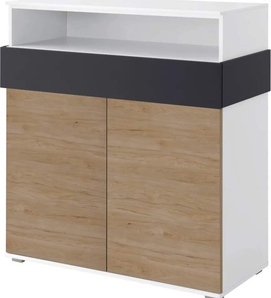 - Korpus aus Holzwerkstoff (Spanplatte) mit kratzfester Melaminharzfolie in weiß, Fronten aus Holzwerkstoff (Spanplatte) mit kratzfester Melaminharzfolie in Hickory, Absetzung aus Holzwerkstoff (Spanplatte) mit kratzfester Melaminharzfolie in anthrazit