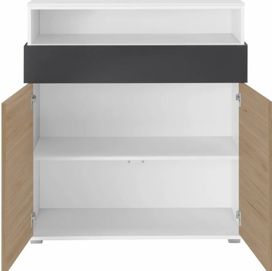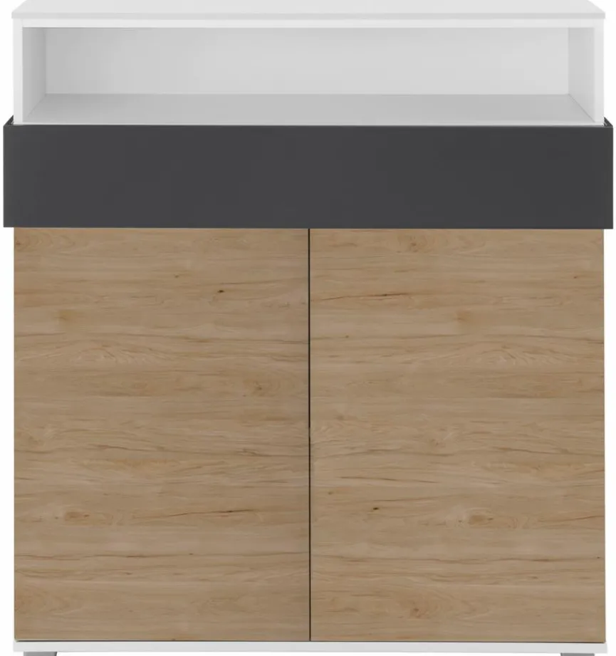 - Mit 2 Türen, 1 Boden, 1 Schubkasten und 1 offenen Fach oben