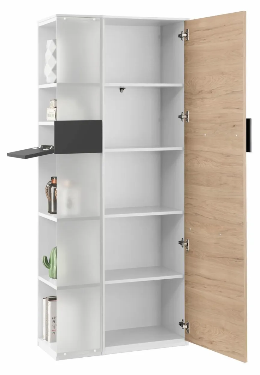 - Aus Spanplatte mit kratzfester Melaminharzfolie in weiß, Tür aus Spanplatte mit kratzfester Melaminharzfolie in Hickory, Absetzung aus Spanplatte mit kratzfester Melaminharzfolie in anthrazit, Teilfront links aus satiniertem Glas