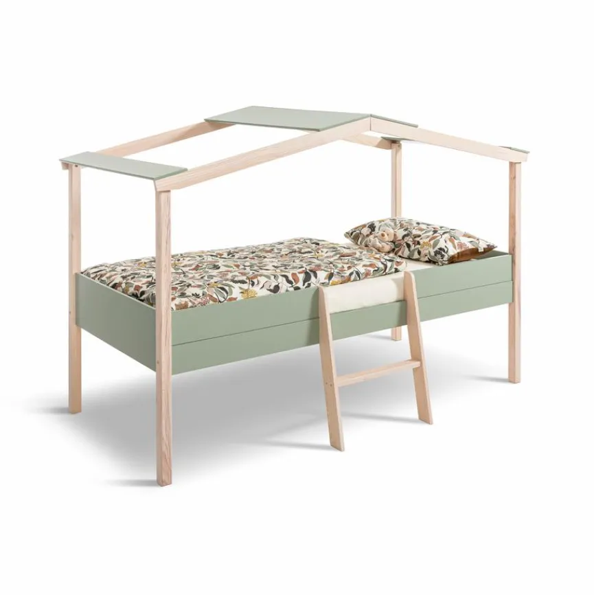 - Seitenteile und Überdachung aus Holzwerkstoff (MDF) in Lichen lackiert, Pfosten, Leiter und Dachgestell aus massiver, klar lackierter Kiefer