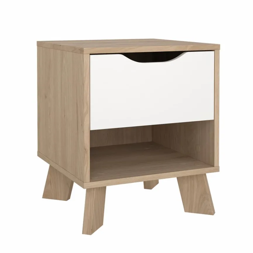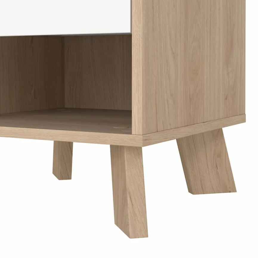 Der Nachttisch Ikast von Tvilum ist ein praktisches und gefällig gestaltetes Kleinmöbel für den Kinderzimmerbereich oder den Gästeraum. Gut anzusehen ist bei der Nachtkonsole die Mischung aus einfarbigem Bereich und edler Holzmaserung. Ins Auge fällt bei dem Nachttisch Ikast zudem die diagonale Anordnung der Standfüße.
