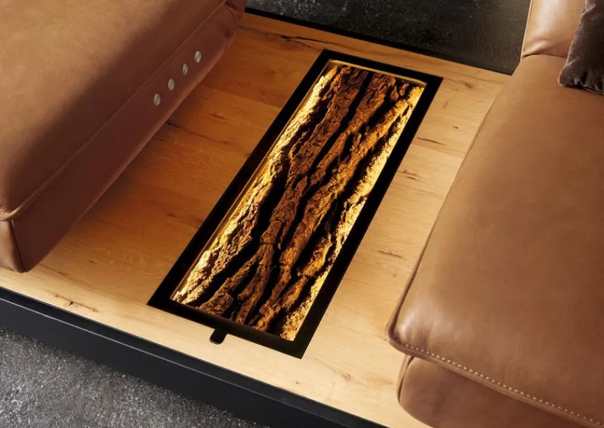 - Gestell aus Metall und Holz (Plateau: Balkeneiche geölt mit Metallrahmen und einer durch Sicherheitsglas geschützten Baumrindeneinlage)