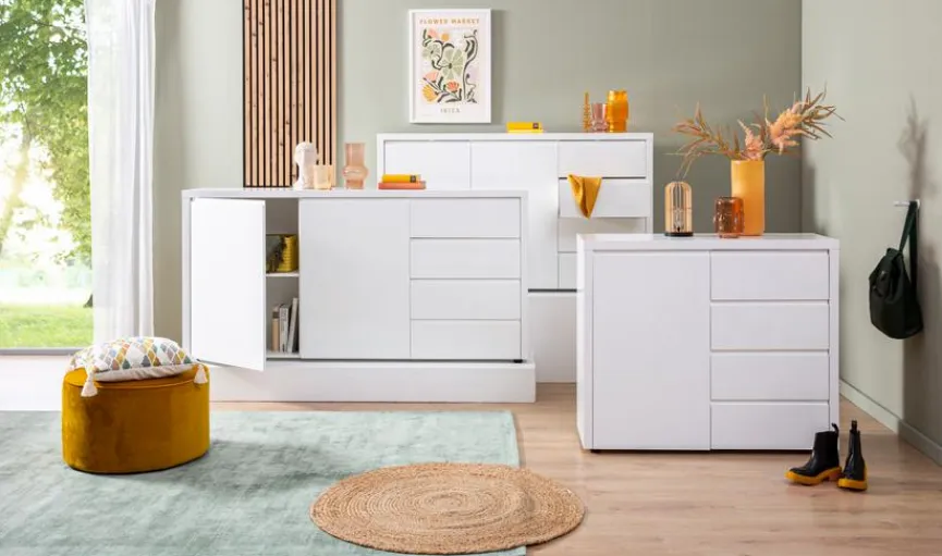 Die Kommode Oslo vereint modernes Design und Funktionalität. Mit ihren klaren Linien bietet die Kommode Oslo nicht nur praktischen Stauraum, sondern wird auch zum Blickfang in jedem Raum. Sie ist ideal für das Schlafzimmer, Wohnzimmer oder den Flur und überzeugt außerdem durch ihre geräumigen Schubladen.