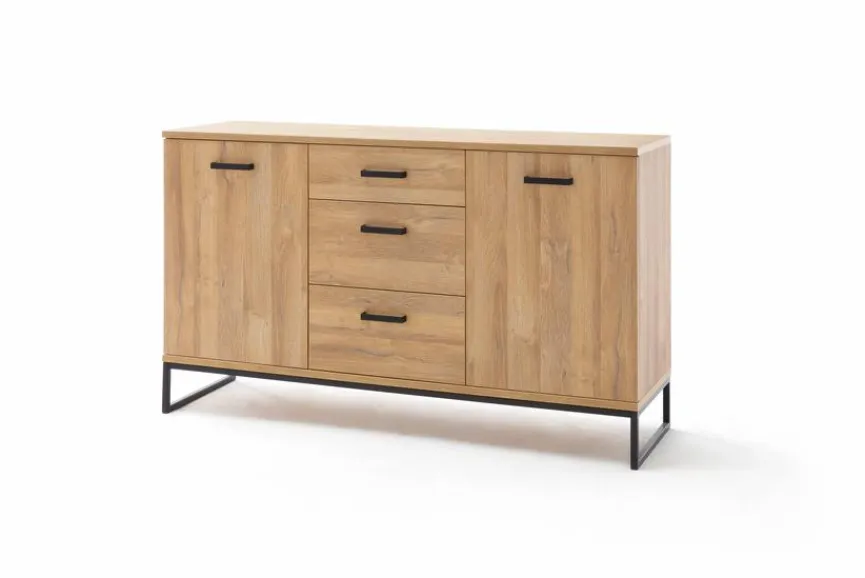 Die Kommode Toledo von MCA passt hervorragend in ein Wohnumfeld, das von geradlinigen Möbeln mit gemütlicher Note geprägt ist. Während das kantige Gestell sowie die schlichten Bügelgriffe der Kommode Toledo aus dem Hause MCA mit einem matten Schwarz aufwarten, sind der Korpus und die Front in Grandson Oak Melamin gestaltet.