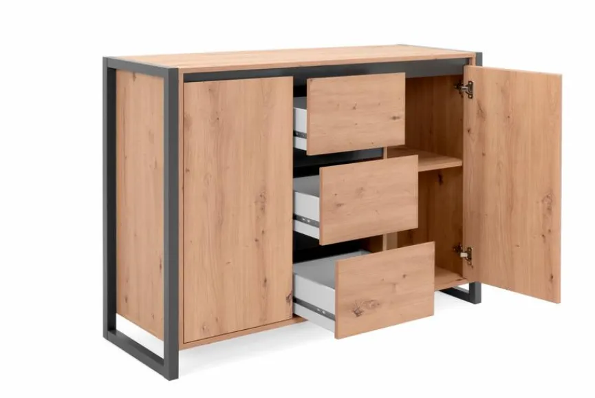 Die Kommode Denver weiß durch ihre klare Formensprache zu gefallen. Dank des attraktiven Holzdekors in Artisan Eiche vermittelt sie dem Raum einen Hauch Nostalgie. Unterstrichen wird dies von dem kontrastierenden Rahmen der Kommode Denver, die viel Platz für allerlei Utensilien bietet. Auch mit einem hübschen Dekorationsobjekt in Szene gesetzt wird sie zum Blickfang in jedem Raum.