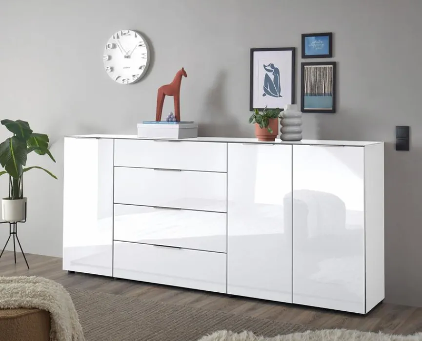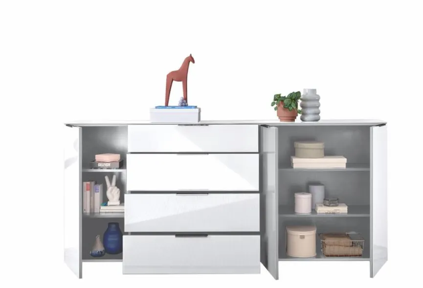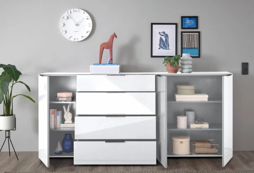 Die Kommode Santorin bietet dank zahlreicher Fächer und Schubladen nicht nur reichlich Stauraum, sondern auf ihr können auch Dekorationsobjekte stilsicher in Szene gesetzt werden. In optischer Hinsicht ist das praktische Möbelstück ebenfalls eine Bereicherung für unterschiedlichste Wohnräume. Dank des klar strukturierten, unaufgeregten Designs fügt sich die Kommode Santorin nämlich harmonisch in zahlreiche Einrichtungskonzepte ein.