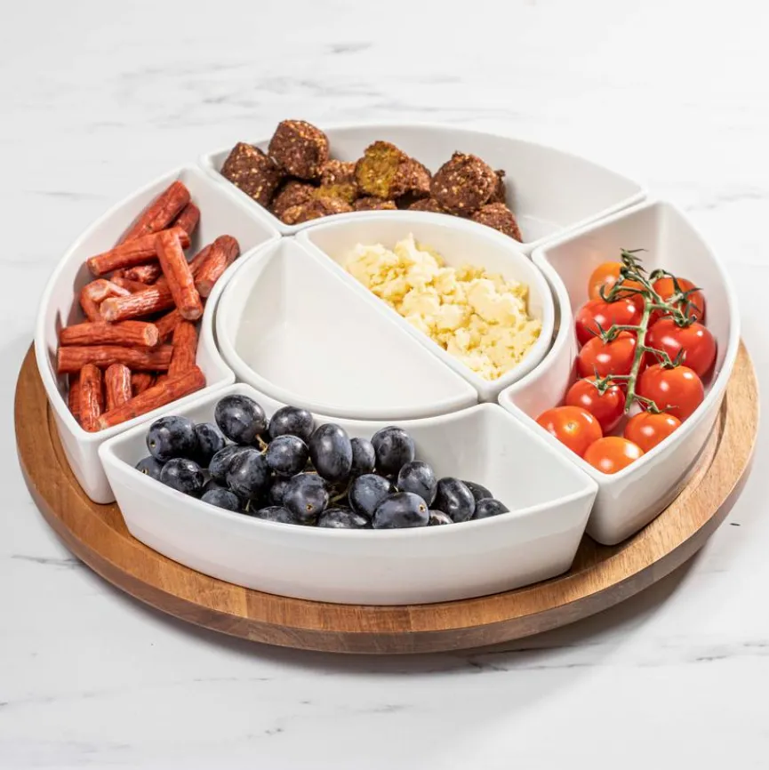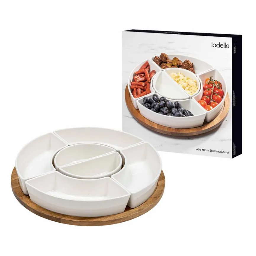 Mit der eleganten Platte Alto Ø 42,4 cm von Ladelle servieren Sie auf zeitgemäße Art Snacks, Salate und Dips. Diese lassen sich in den insgesamt 6 Schälchen, die kunstvoll angeordnet die Servierplatte zieren, besonders geschmackvoll anrichten. Gleichzeitig punktet die Platte Alto Ø 42,4 cm mit ihrem stilvollen Design, das einen besonders ausdrucksstarken Blickfang zu den verschiedensten Anlässen darstellt.