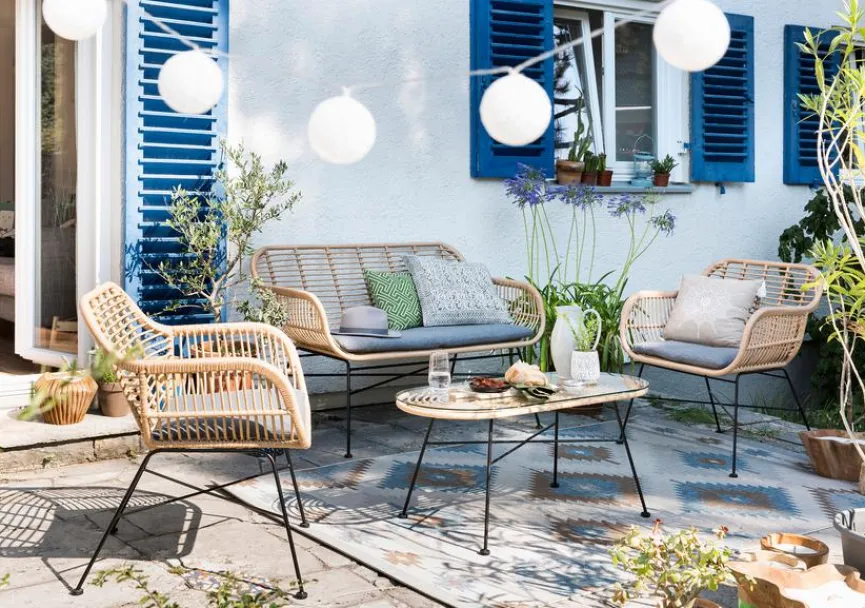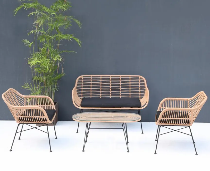 - Set besteht aus 2x Gartenstuhl, 1x 2-Sitzerbank und 1x Loungetisch