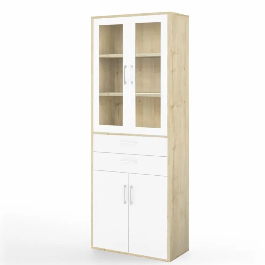 - Mit 2 Glastüren, 2 Schubkästen, 2 Türen und 5 festen Einlegeböden