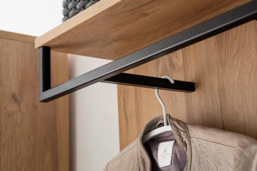 Der Eingangsbereich ist die Visitenkarte eines Hauses, sagt man. Das Garderobenpaneel Toledo von MCA sorgt für einen besonders guten ersten Eindruck. Außerdem schafft das Dielenpaneel mit drei Haken, Kleiderstange und Hutablage für jedes Kleidungsstück einen aufgeräumten Platz. Das Garderobenpaneel Toledo präsentiert sich mit fein gemasertem Holz und im geradlinigen Design von MCA, was seine Hochwertigkeit noch unterstreicht.