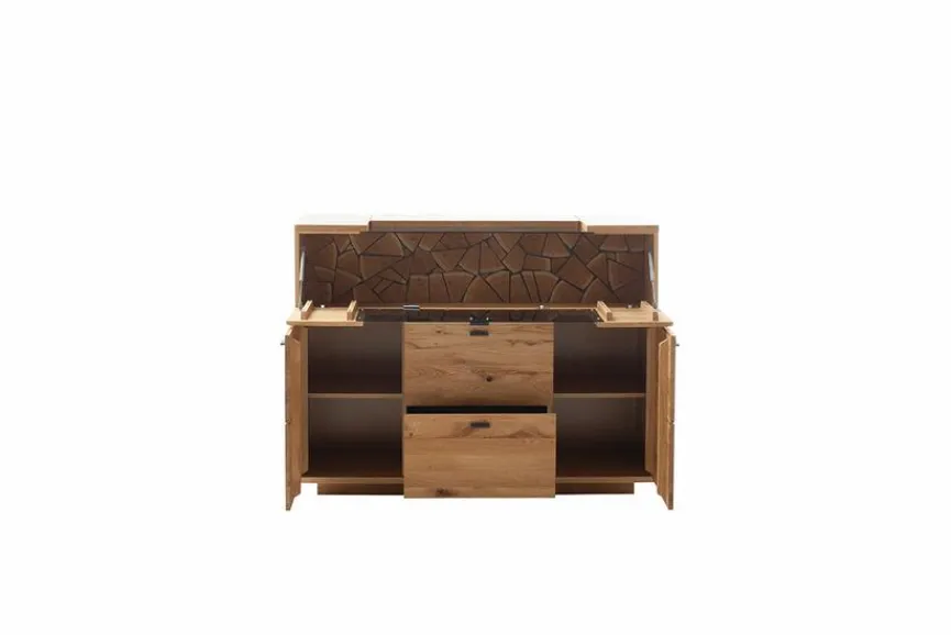 - Sichtbare Rückwand aus Scheitholz, Rückwand hinter Türen und Schubkästen aus Eiche Dekor