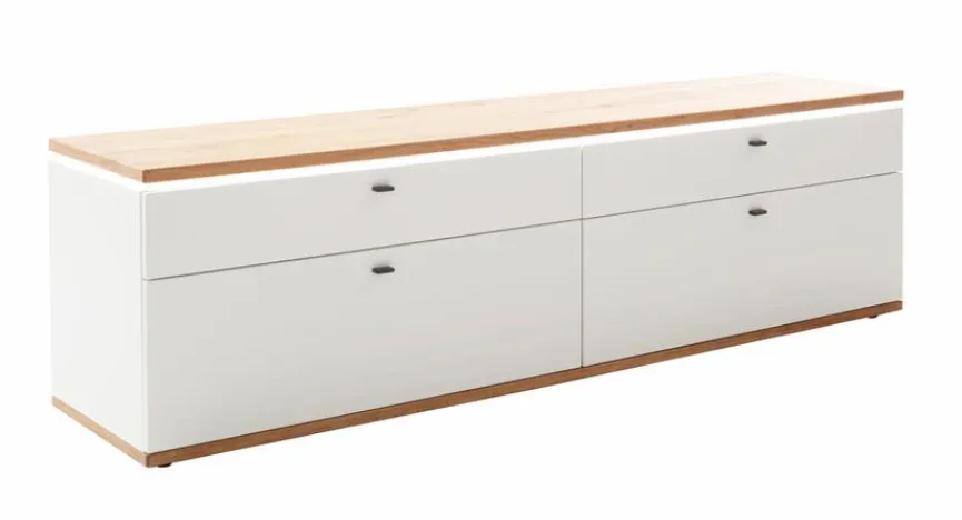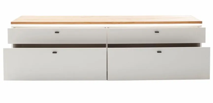 - Korpus und Front aus Holzwerkstoff (Spanplatte) mit Lack in Soft White, Absetzung aus Holzwerkstoff (Spanplatte) Ast/Balkeneiche furniert in Wildeiche geölt