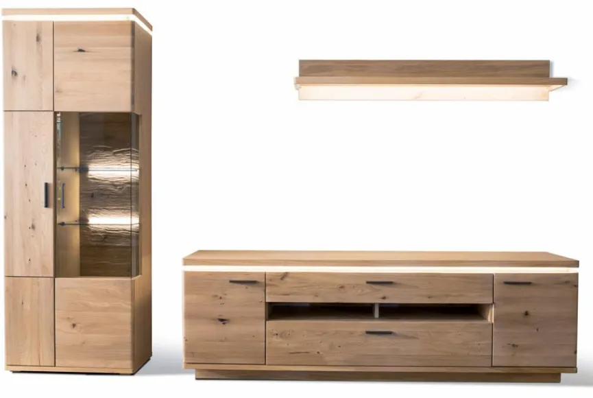 - LED-Beleuchtung vom Oberboden vom TV-Lowboard und der Vitrine ist inklusive. Sonstige Beleuchtung und Zubehör ist optional gegen Mehrpreis erhältlich