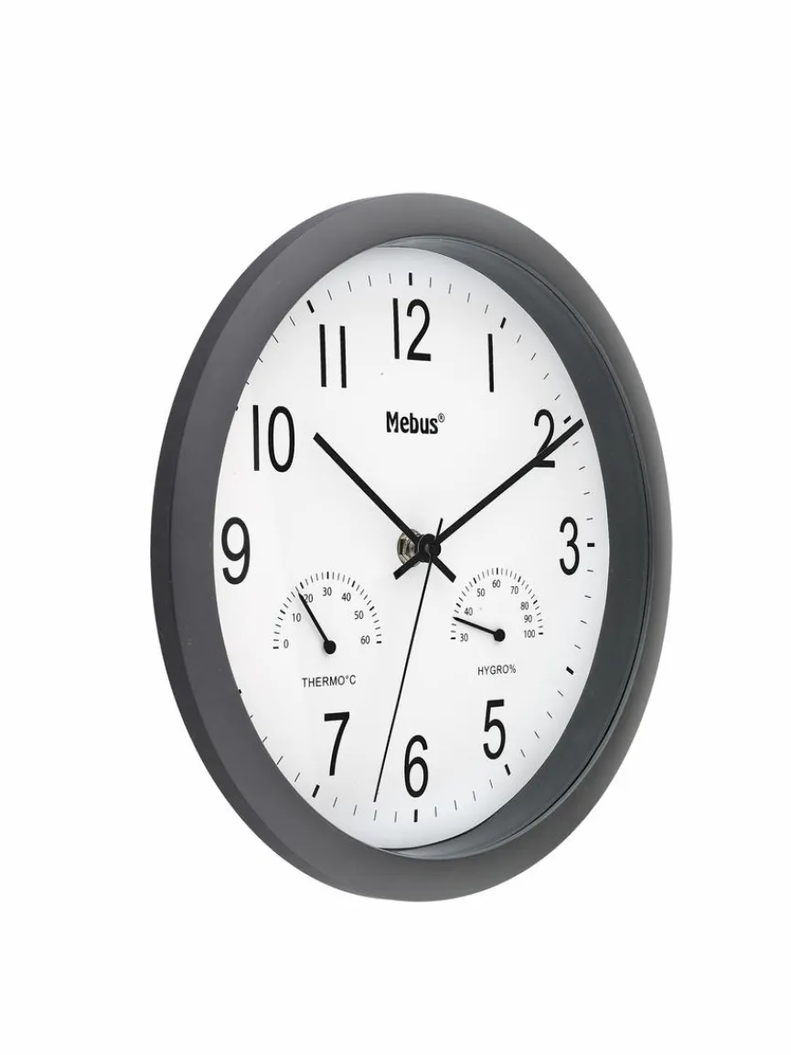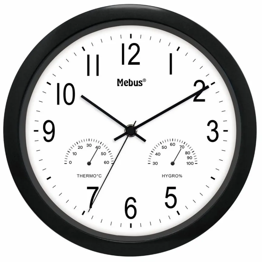 Mit der Quarzwanduhr 56464 des Herstellers Mebus haben Sie nicht nur die exakte Uhrzeit im Blick, sondern darüber hinaus auch die aktuelle Temperatur und den Luftdruck. Dabei lassen sich die Angaben der Uhr von Mebus dank des großen Ziffernblatts problemlos ablesen. Außerdem ist das Anbringen der Quarzwanduhr 56464 an der Wand denkbar einfach.