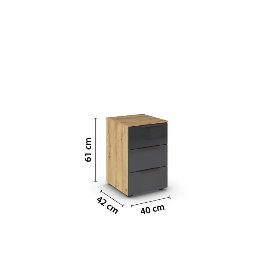 Mit drei Schubladen bietet die Nachtkommode Flipp reichlich Platz für Bücher, Zeitschriften oder etwa Hygieneartikel. Doch dieser Nachttisch ist nicht nur ungemein praktisch, er ist auch ein ästhetischer Gewinn für Ihr heimisches Schlafzimmer. Vor allem das geschmackvolle Zusammenspiel der Oberfläche in Holzoptik mit den schicken Spiegelgläsern verleiht der Nachtkommode Flipp ein ausgesprochen attraktives Erscheinungsbild.
