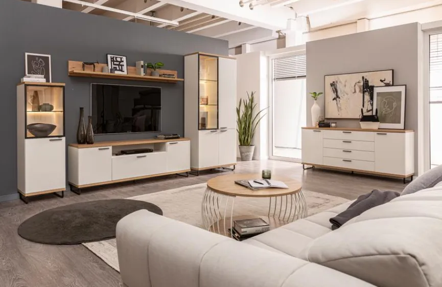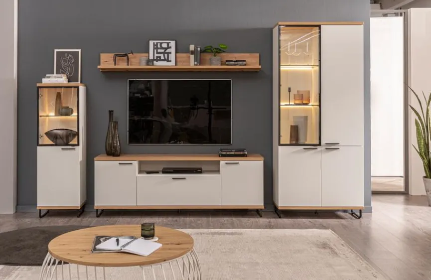- Korpus und Front aus Holzwerkstoff (Spanplatte) mit kratzfester Melaminharzfolie in Polarweiß, Absetzung aus Holzwerkstoff (Spanplatte) mit kratzfester Melaminharzfolie in Artisan Eiche