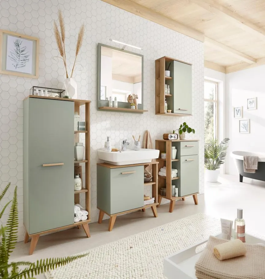 - Front aus Spanplatte mit Melaminharzfolie in Salbei, Korpus aus Spanplatte mit Melaminharzfolie in Salbei/Riviera Eiche quer Nachbildung