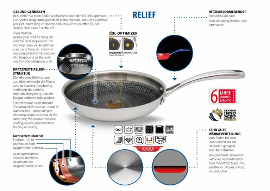 Eine schöne Option ist die Bratpfanne Relief Ø 24 cm von ELO, wenn Sie Ihre Speisen gerne kross anbraten. Dieses Modell verfügt über eine Antihaftversiegelung und über ein spezielles Öl-Dosiersystem, das einen reduzierten Öleinsatz ermöglicht. Zudem lässt sich die Bratpfanne Relief Ø 24 cm aus dem Hause ELO einfach reinigen.