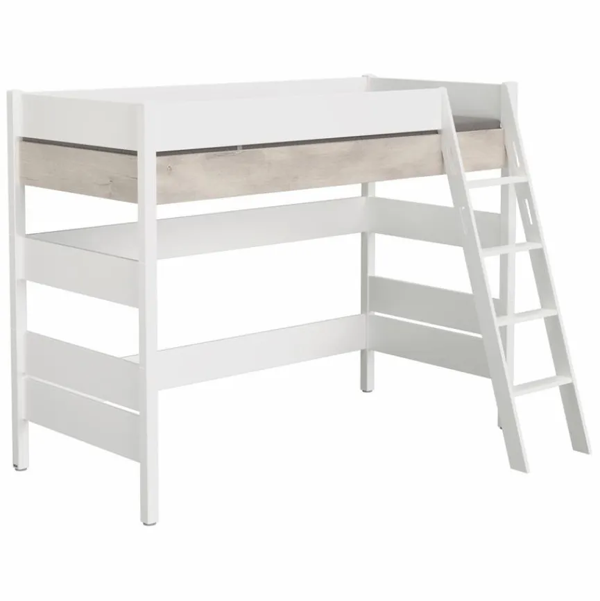 - Aus Holzwerkstoff (Spanplatte) mit kratzfester Melaminharzfolie in kreideweiß, Absetzung in Eiche-Nautik-Nachbildung, Bettpfosten aus massiver und weiß lackierter Buche